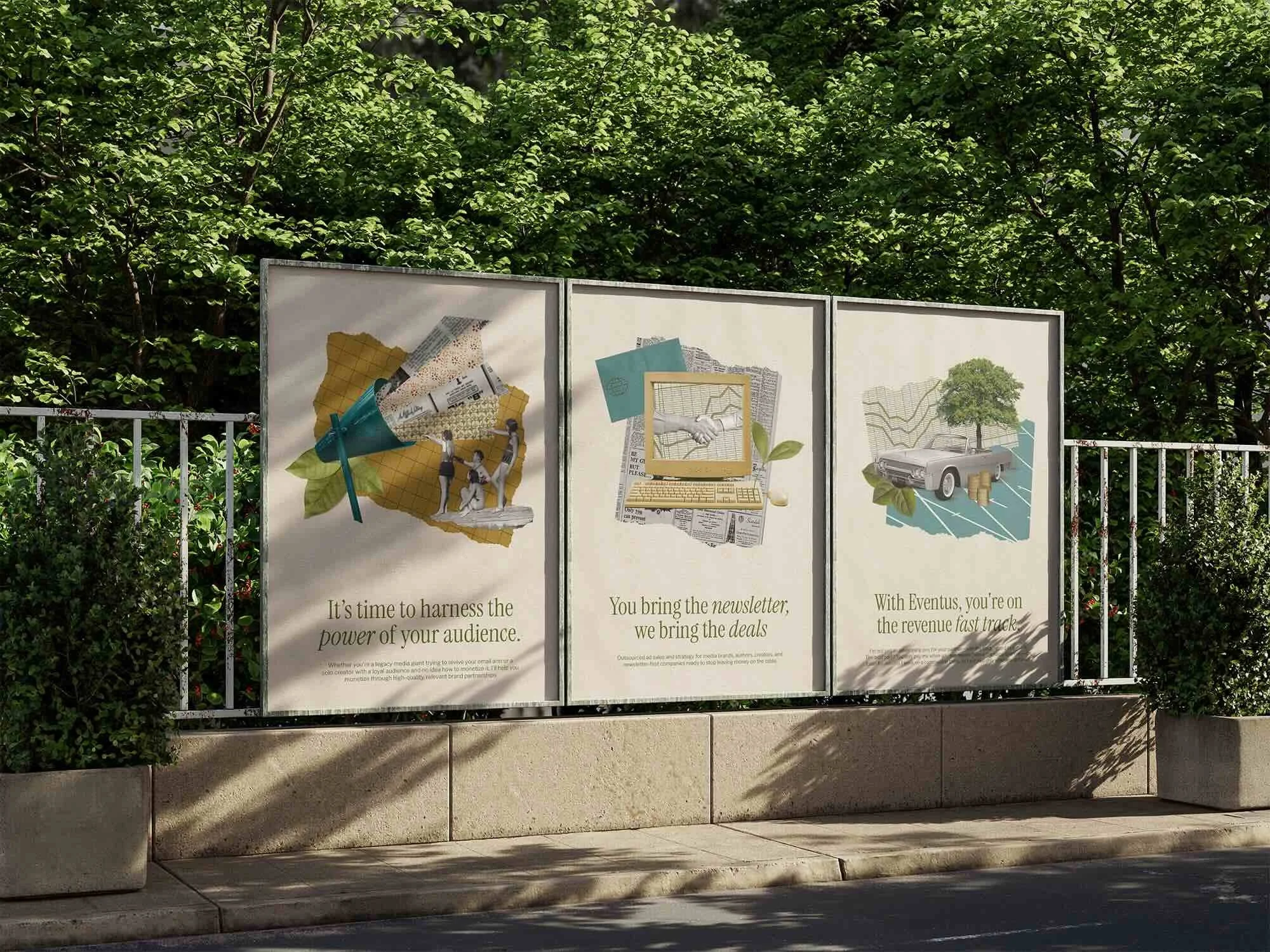 Creating dynamic photo assets had it’s own challenges —what images does one use to represent abstract digital concepts like revenue growth, audience engagement, and email newsletters? Wanting to avoid stuffy corporate stock imagery, I opted to collage imagery that blends the human, the organic, and the man-made.